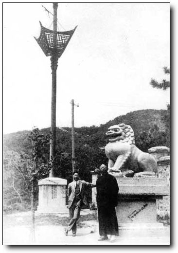 1932年关友声(右)与好友老舍(左)在千佛山下合影