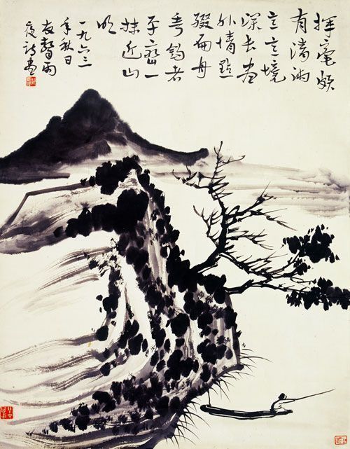 题画诗:挥毫颇有清湘意,意境深长画外情。点缀扁舟垂钓者,平峦一抹近山明。